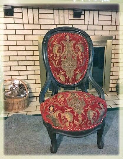 This chair has been in the family for over 100 years. I found this chair in the attic of the family home(it belonged to Jim’s Aunt Margaret, who passed in the 60’s (she inherited the chair from her grandmother) – her cat, Casper, had destroyed the fabric all over) so she had it stored for later repair