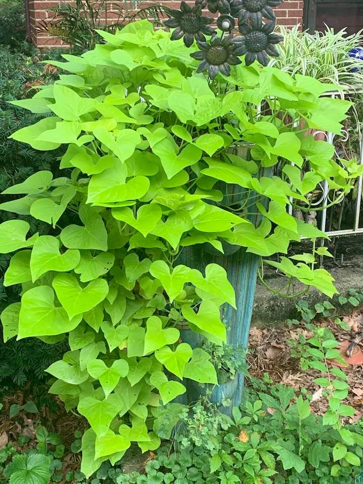 Almost time to put a few orange pumpkins in here. Love this planter for these vines and adding fall colors like mums and pumpkins