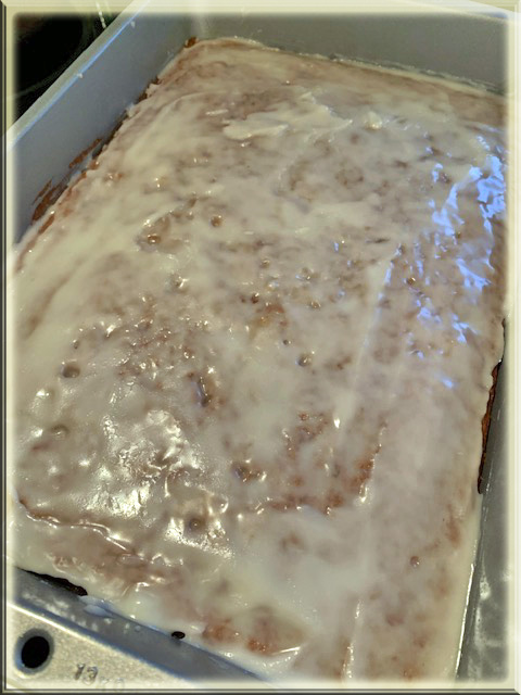 Note: I was trying to decide on a butter pecan cake mix or a spice cake mix – I chose the pecan cake mix last year, which was excellent; and this year, I used a butter yellow cake mix because it was a great price, and this tastes amazing. I believe the spice cake mix which is on the shelves now would be really good in this as well. This will definitely hold its shape after sitting in the refrigerator, because it did while hot. This will be a great breakfast treat. This picture shows how it held it’s shape while still hot