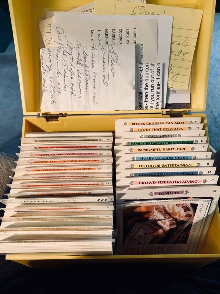 I decided to clean out a vintage night stand in the attic. I assumed my late mother in law kept all receipts, and cancelled checks in it. I found this heavy, very full box in bottom with handwritten recipes. 1971