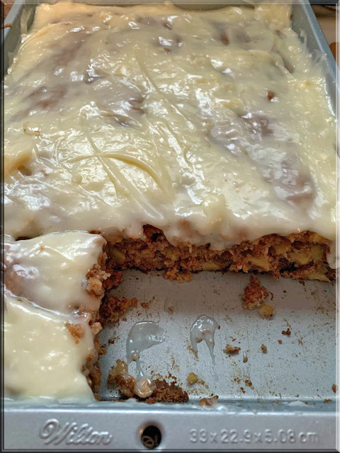 - 2. In a small bowl, beat cream cheese and butter. Add confectioners’ sugar, beating until smooth. Spread over cake. Refrigerate leftovers.