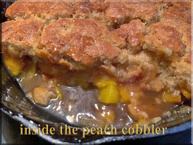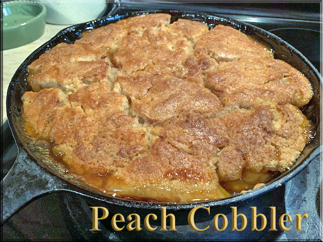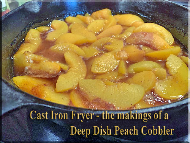 Peach Cobbler in the cast iron fryer pan – deep pan, so I tripled the recipe for the peach filling and doubled the topping recipe.