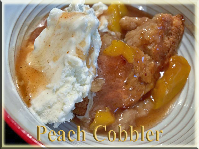 What I did differently was I used canned peaches, and instead of using boiled water for the topping, I used peach juice from the peaches. (boiled it – I believe instead of 1/4 cup like what is called for in the water; it took closer to 1/2 cup of peach juice
