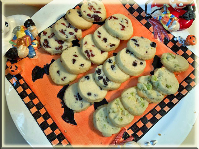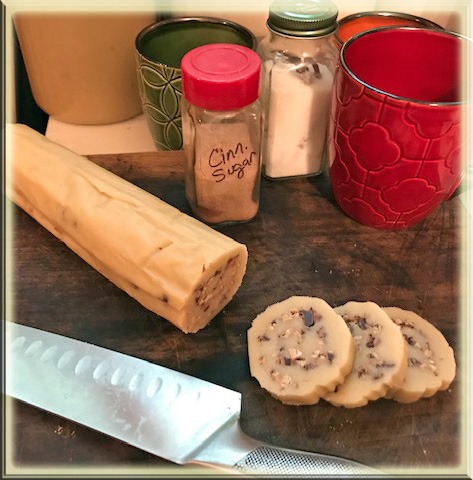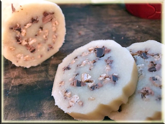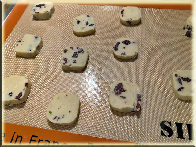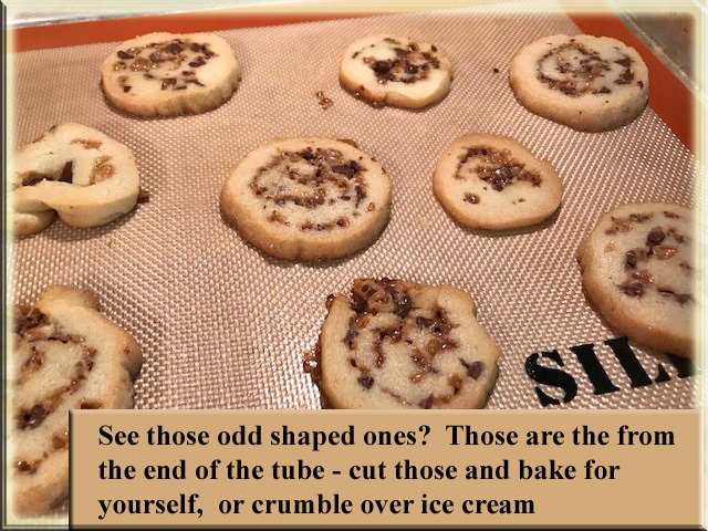 Preheat oven to 375. Unwrap dough and cut crosswise into ¼ inch slices. You need to experiment here with width. Too thin – they bake quickly are very crispy when they cool down, like a chip. I decided I preferred them thicker. The thicker ones barely brown and they are done – they look like a touch of brown on the edges. Place slices 2-inches apart on a paper-lined baking sheet. I used my silicone mat. Bake for 8-10 minutes or until the edges are brown but watch and write down your time. Cool on pan for 2 minutes and then transfer to wire rack to cool completely.