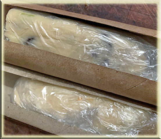 To differentiate the two while sitting in the fridge – I pressed the cherry log on each side so that it resembled a square/cube. You can tell the difference in taste, of course, but not right away looking at them side by side.