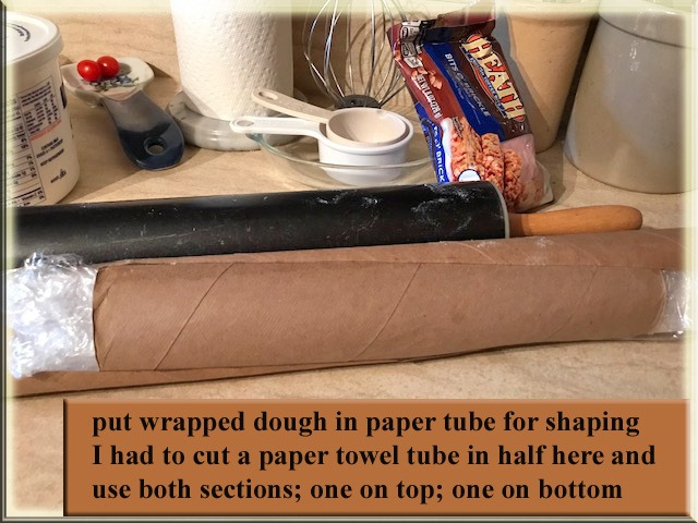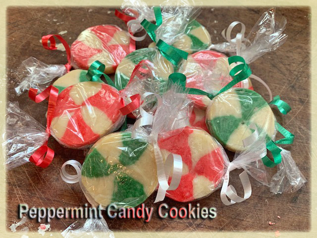 One of the photos shows how I put the roll of dough in wrapping paper tubes to leave in the fridge so that the dough would not flatten on the side it sat on and this also protected it from other items bumping in to it in the fridge I also do orange extract to the white dough and raspberry or cherry extract to the red dough. Melted chocolate to dark dough and mint extract or almond extract to the white dough. I’ve also done chocolate and peanut butter. There are so many ways you can create with these all throughout the year. Among the variety of flavors I combine with this cookie – the peppermint is my favorite. On some, I’ll put the color on outside and then some times I’ll switch because it really makes the dish festive