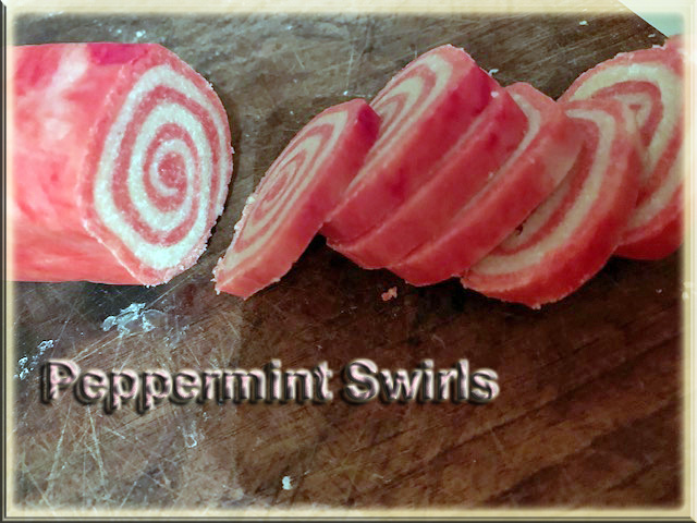 I make these every year because they are a favorite of mine. I love munching on these with coffee in the morning. I prepare these; wrap them in plastic saran wrap; wrap in parchment; wrap a paper towel tube around to keep the shape while in the refrigerator (that way if anything bumps in to them – the tube protects them) All I do is slice and bake when I am craving them. The boys called these peppermint swirls when they were little and it stuck in our home.