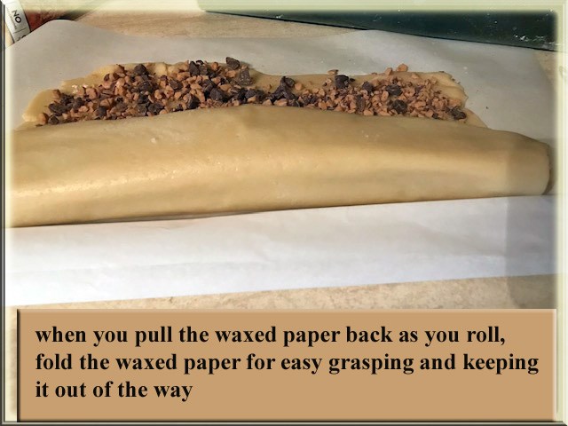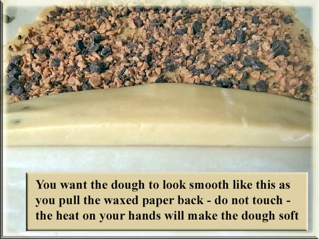 On a sheet of waxed paper, roll dough into a 10-inch square. In a small bowl, combine toffee bit and chocolate chips; sprinkle over dough to within 1 inch of edges. Using waxed paper, tightly roll dough jelly-roll style, removing the paper as you roll. Wrap in waxed paper and/or plastic; put in tube for shaping; refrigerate until firm enough to slice (I leave in fridge overnight.