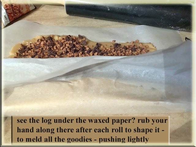 These logs freeze well. Just wrap in saran wrap; wrap a paper tube around to hold shape; put in ziploc freezer bag with name; oven temp; and baking time. When you pull the log out of the freezer – let it sit for about 15 minutes; I do this while the oven is warming.