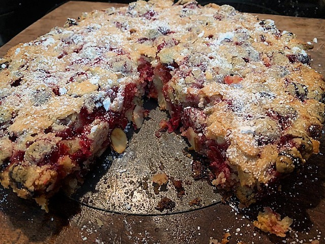 This is definitely cranberry flavor, I had ice cream with it to help with the tartness of the dish. I like the taste of cranberries, so I’m good with how tart this was. I followed the instructions, and also added some orange zest and cinnamon. The almonds are a must; they are crunchy and flavorful in this tart. This is delicious. I will make this for a fish fry I go to during the summer.