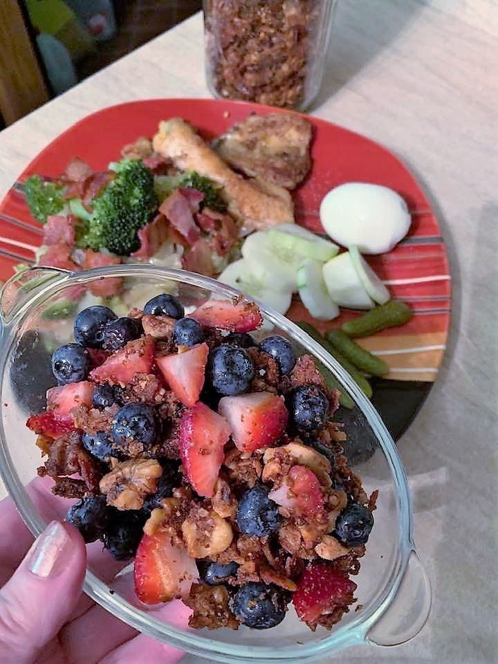 Game Changer for me! I just had a 1/4 cup of this with some strawberries and blueberries and a couple tablespoons of unsweetened almond milk. So delicious! I stored this in a large mason jar, in the fridge.