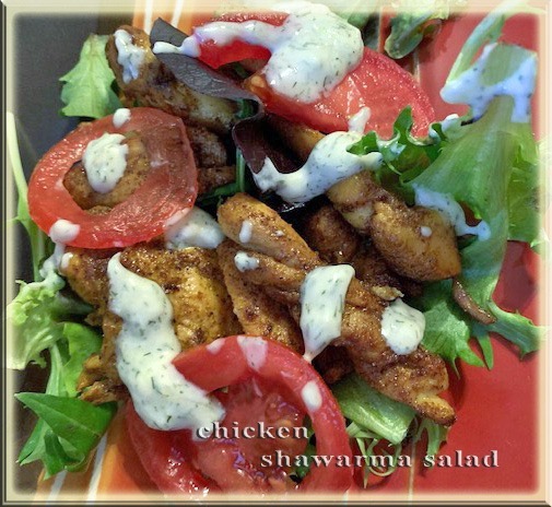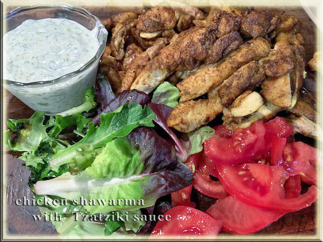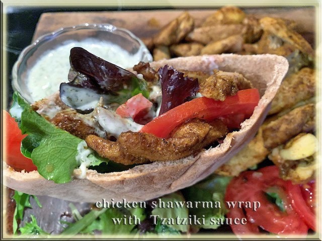 A Greek and Middle Eastern combination. Chicken Shawarma wraps with Greek Tzatziki sauce.