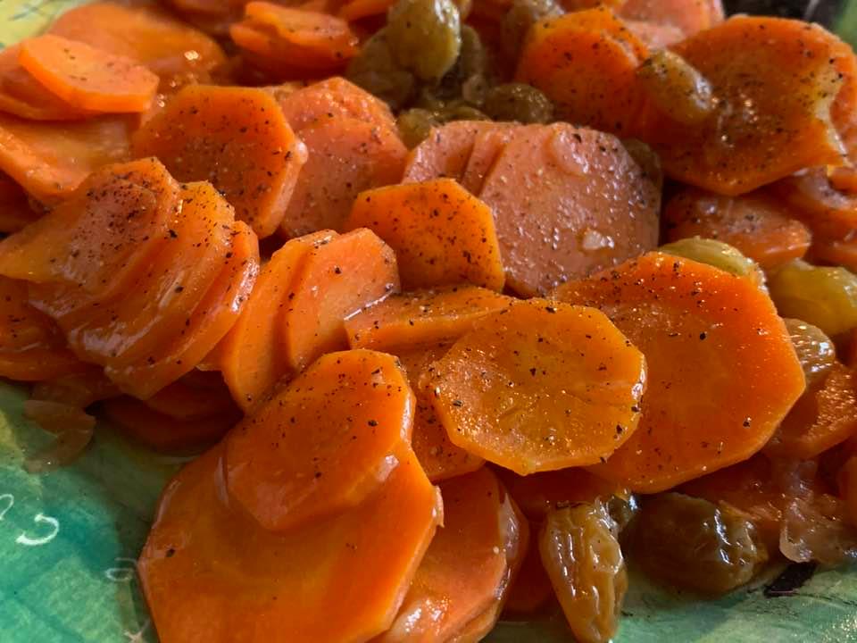These are fun to snack on. I would definitely make these for Thanksgiving. I did not have dark raisins; just used what I had, which were golden. This says 15 minutes or until carrots are tender. I cooked mine for 1/2 hour in a cast iron pot; added the brown sugar, and then cooked for another 10 minutes. I also added pepper to my dish, as I like pepper, and it works with this dish.