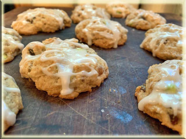 In a large bowl, cream the butter and sugar until light and fluffy. Beat in the egg, zucchini, and lemon peel. Combine flour, baking soda, baking powder, cinnamon and salt; gradually add to the creamed mixture and mix well. Stir in raisins and walnuts.Drop by Tablespoonfuls 3 in. apart onto lightly greased baking sheet. Bake at 375 for 10 minutes – or until lightly browned. Here in Indiana, on an overcast day – it took about 14 minutes.