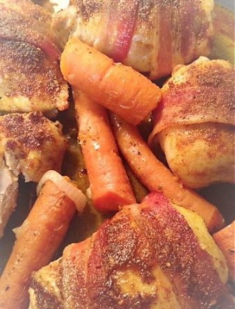 From the book Practical Paleo. I make the spice mix in quadruple batches, and put in a spice container – left in the cabinet to grab quickly when this dish is requested. I share a photo of the bottle in one of the photos. I made up a bottle for the boys so they can make this in Colorado (which they have, because I’m in Indiana) Alex, my 23 year old, loves this dish. I give the bacon to the strays because I don’t care for it like this, but it definitely helps the flavor of the dish during the baking process.