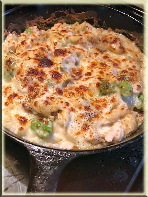 Caste Iron Skillet Rotisserie chicken, broccoli, bacon, pasta shells, mozzarella Cheese – Rotisserie from Sams because they are delicious. I used 2% milk. Prepare the pasta per package instructions – this equaled about 2 1/2 to 3 cups, drain, and set aside (I used medium shell pasta) All of the next part was done in the same cast iron skillet. You can cook the bacon whole and then chop it, but I chop the bacon first, and then cook it, then scoop the bacon out and set aside in a dish – Leave the bacon fat in the skillet; stir fry the broccoli just to get that charred look – take the broccoli out of the pan, and set aside; (I put the broccoli in same dish as the cooked bacon pieces); add 1 tsp of garlic; (or more to your liking) add about 1/4 or 1/3 cup flour; (I just scooped it out with a large serving spoon – so that was about what it looked like); mixed that in the bacon drippings; add 2 1/2 cups of milk , start with 2 cups, because after 2 it looked like it needed a bit more; stirred all of this until it got thick; add 1 cup mozzarella (because I have a quantity of this from New Years charcuterie board ); stir until melted; add some kosher salt to your liking, add the chicken (about 3 1/2 to 4 cups – chopped or shredded); add the broccoli and the bacon bits – mix all together; top all of this with 1/2 to 1 cup of mozzarella. Put in oven under broiler for about 3 or 4 minutes until cheese turns brown; I add pepper to the top when I pulled it out of the oven