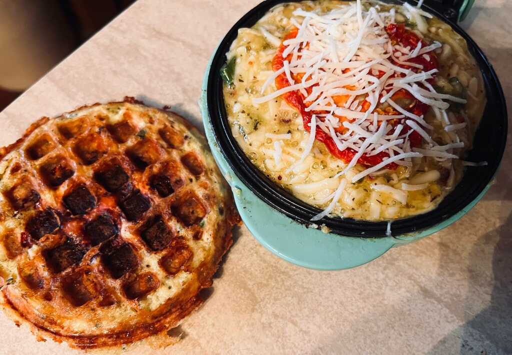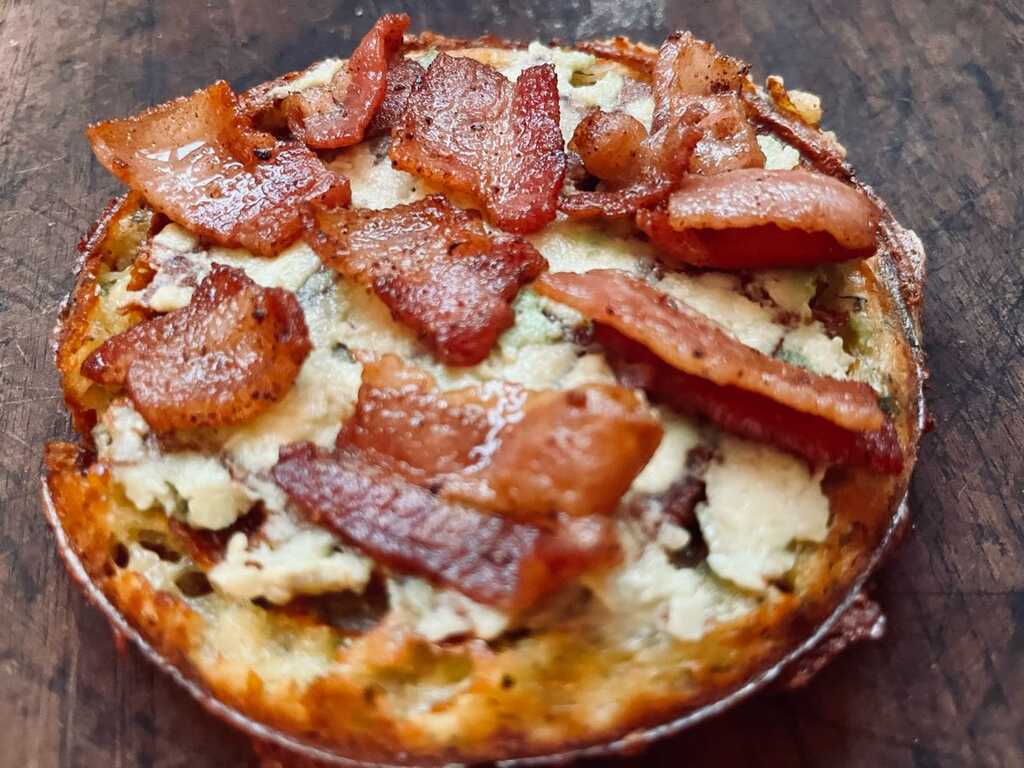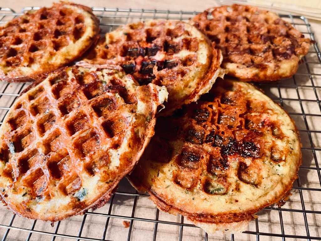 I use a mini iron, because I it’s easy, quick and a small sandwich. I used a special melting cheese I found at Meijers, but you can use anything. I precook bacon, chop it, and add to a container for using in salads, stir-fry’s and now chaffels. I add the bacon to the cheese, before closing the iron. That way, the bacon stayed in, and was part of the sandwich. I enjoyed the crunch of the sandwich. Delicious, easy and fun idea.