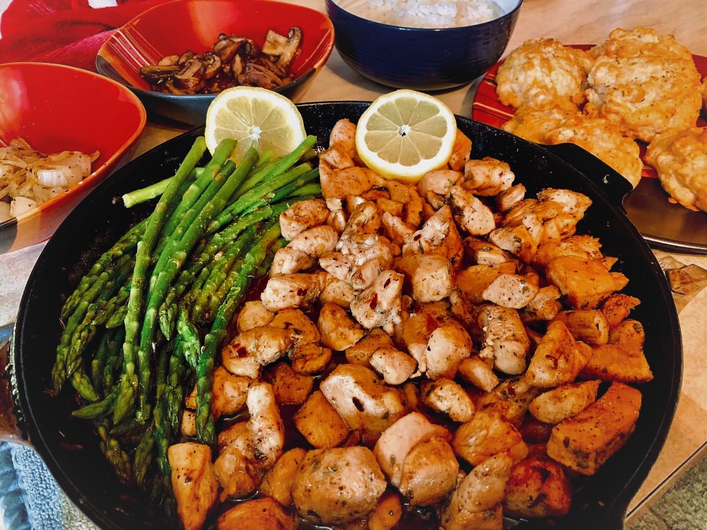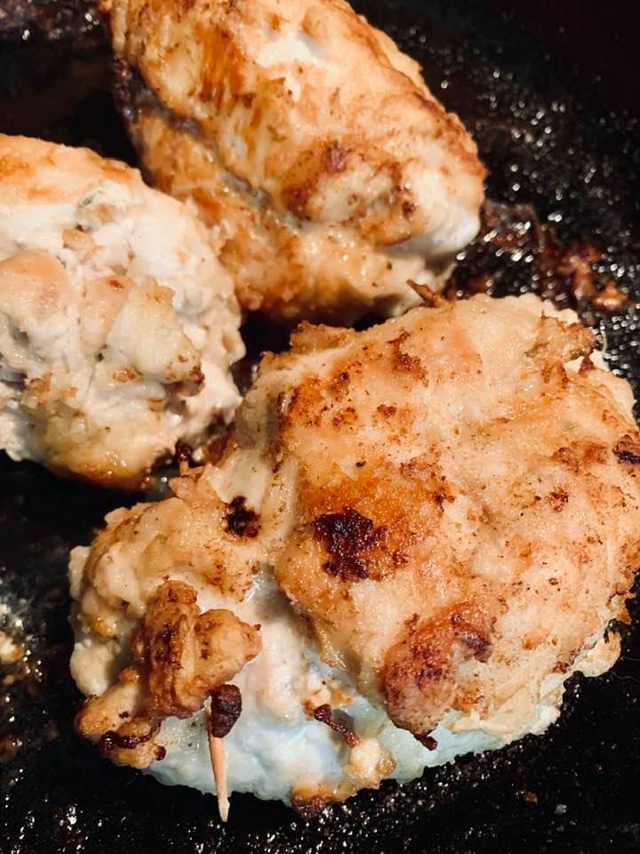 Caste Iron Skillet Rotisserie chicken, broccoli, bacon, pasta shells, mozzarella Cheese – Rotisserie from Sams because they are delicious. I used 2% milk. Prepare the pasta per package instructions – this equaled about 2 1/2 to 3 cups, drain, and set aside (I used medium shell pasta) All of the next part was done in the same cast iron skillet. You can cook the bacon whole and then chop it, but I chop the bacon first, and then cook it, then scoop the bacon out and set aside in a dish – Leave the bacon fat in the skillet; stir fry the broccoli just to get that charred look – take the broccoli out of the pan, and set aside; (I put the broccoli in same dish as the cooked bacon pieces); add 1 tsp of garlic; (or more to your liking) add about 1/4 or 1/3 cup flour; (I just scooped it out with a large serving spoon – so that was about what it looked like); mixed that in the bacon drippings; add 2 1/2 cups of milk , start with 2 cups, because after 2 it looked like it needed a bit more; stirred all of this until it got thick; add 1 cup mozzarella (because I have a quantity of this from New Years charcuterie board ); stir until melted; add some kosher salt to your liking, add the chicken (about 3 1/2 to 4 cups – chopped or shredded); add the broccoli and the bacon bits – mix all together; top all of this with 1/2 to 1 cup of mozzarella. Put in oven under broiler for about 3 or 4 minutes until cheese turns brown; I add pepper to the top when I pulled it out of the oven
